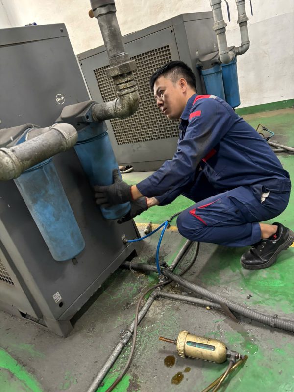 - Định kỳ hằng năm: Tổng kiểm tra toàn bộ hệ thống khí nén gồm máy nén, máy sấy, bình tích áp, đường ống và bộ lọc. Siết chặt liên kết cơ khí, thay thế vật tư hao mòn, hiệu chuẩn cảm biến và kiểm tra hệ thống bảo vệ an toàn nhằm đảm bảo hệ thống hoạt động ổn định, tiết kiệm điện và đạt tuổi thọ tối đa.
